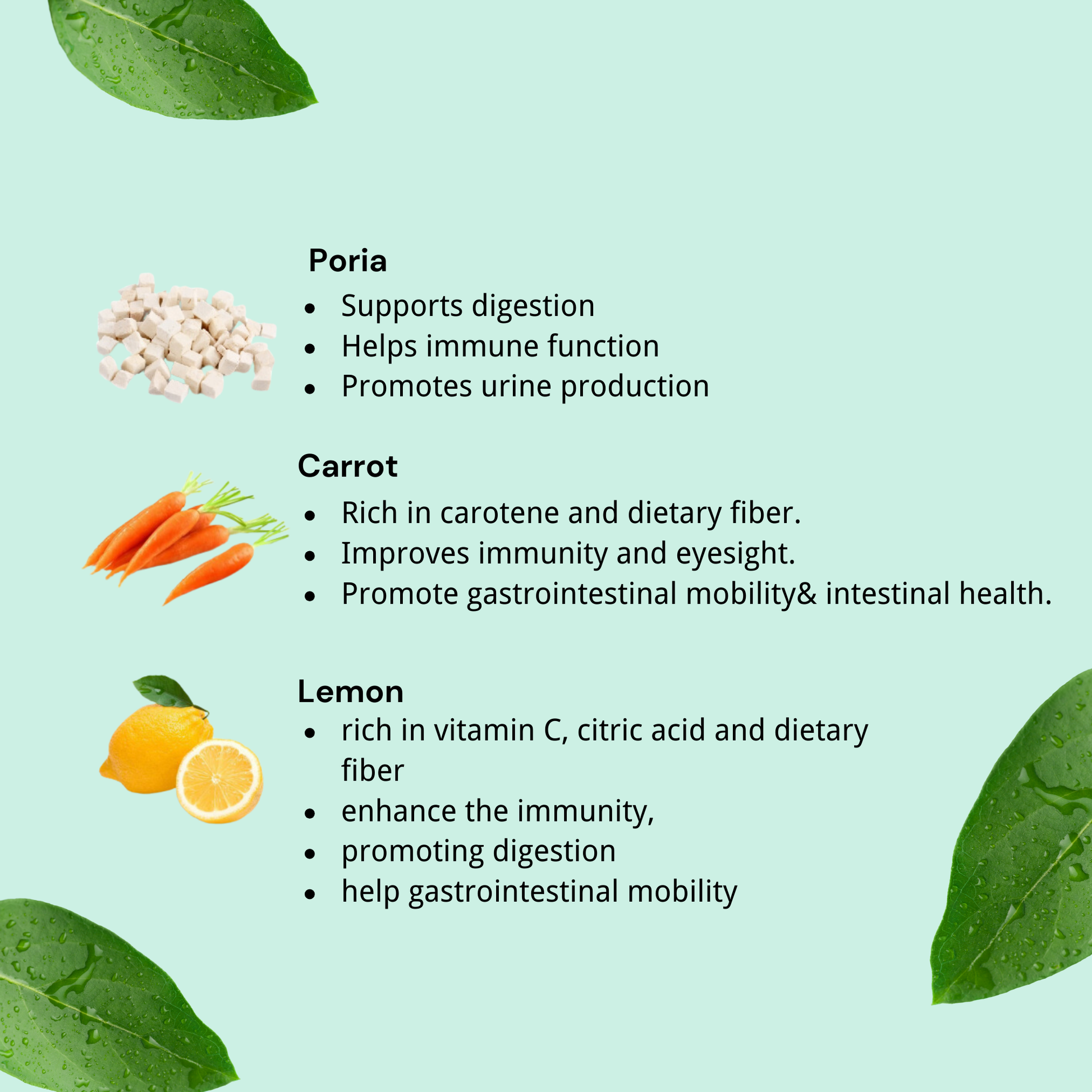 🌱 Our product uses a natural herbal formula, emphasizing the moisturizing effects of seaweed, the regulation of blood sugar and urinary health by poria, and the benefits of carrots and lemons for the immune system, vision, and digestive system.