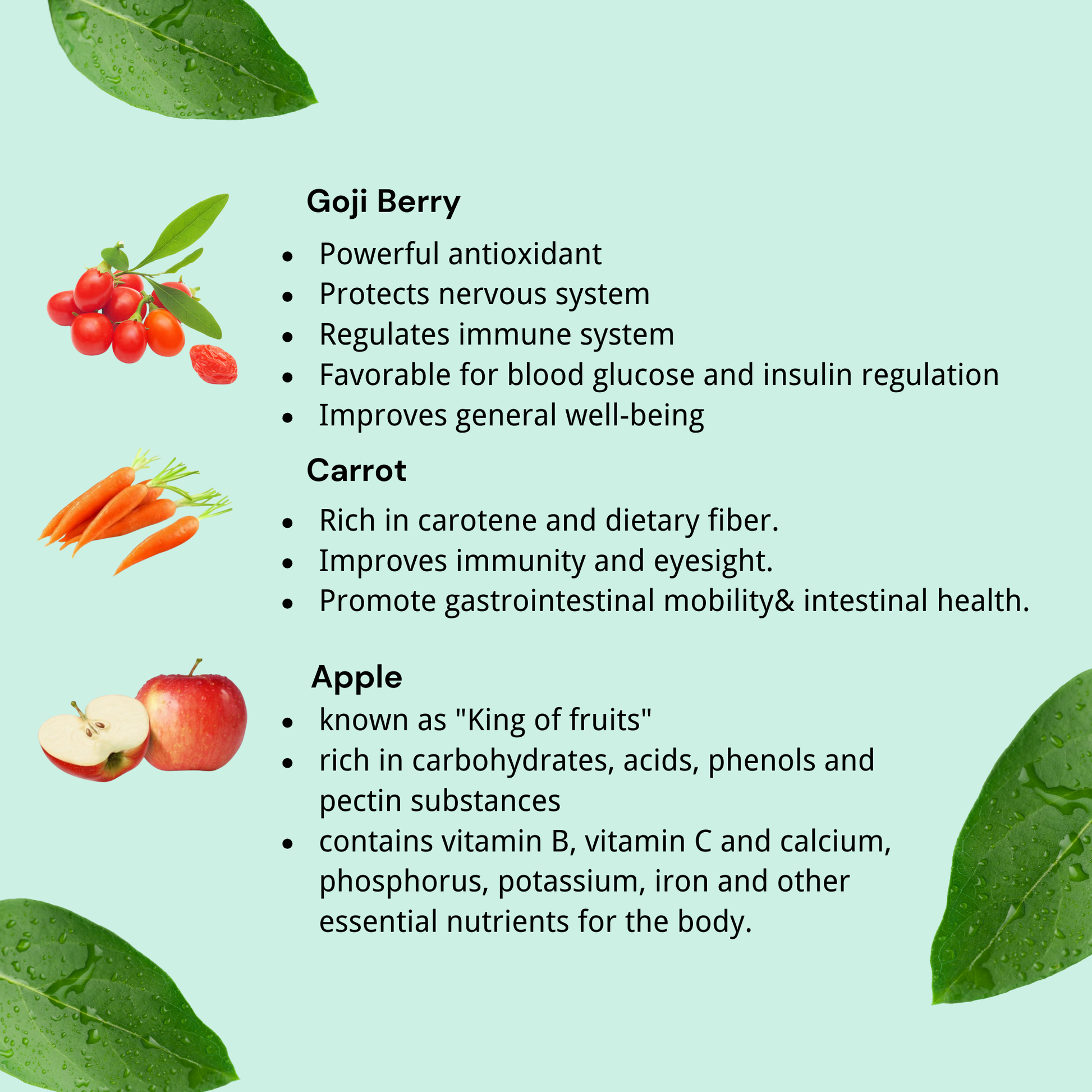 🍃 Our formula features premium ingredients like green tea, goji berries, carrots, and apples. Green tea helps clean the mouth, improve breath, and promote oral health; goji berries have powerful antioxidant properties, protecting the nervous system, regulating the immune system, and enhancing overall health; carrots are rich in beta-carotene and dietary fiber, boosting immunity and vision, and promoting gut health; apples are packed with nutrients, aiding in weight control and beautifying the coat, providing comprehensive nutrition for your dog. 🌟